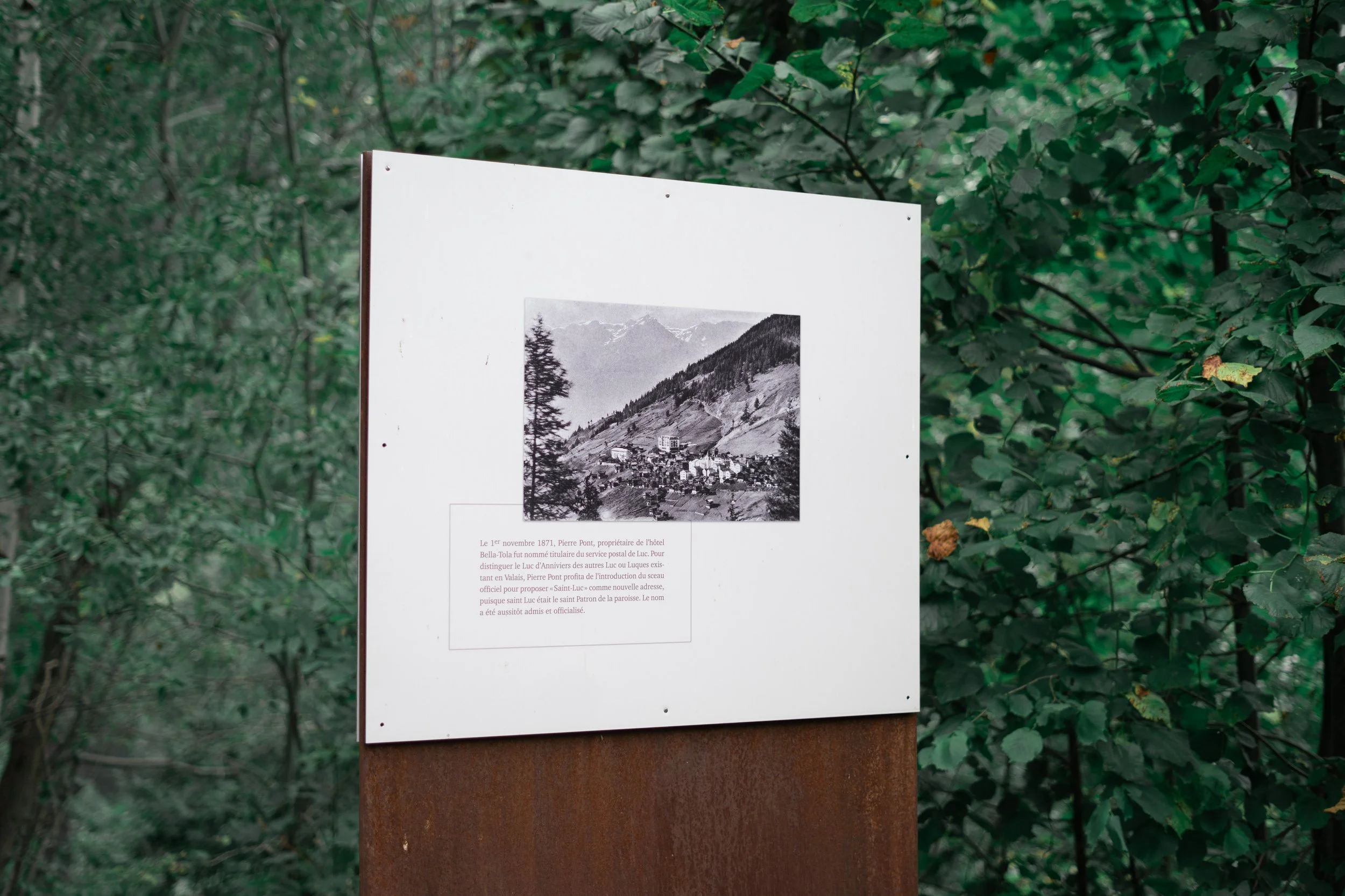 Panneaux didactiques pour une exposition plein air qui retrace, en image, l’histoire des débuts du tourisme estival dans le Val d’Anniviers.